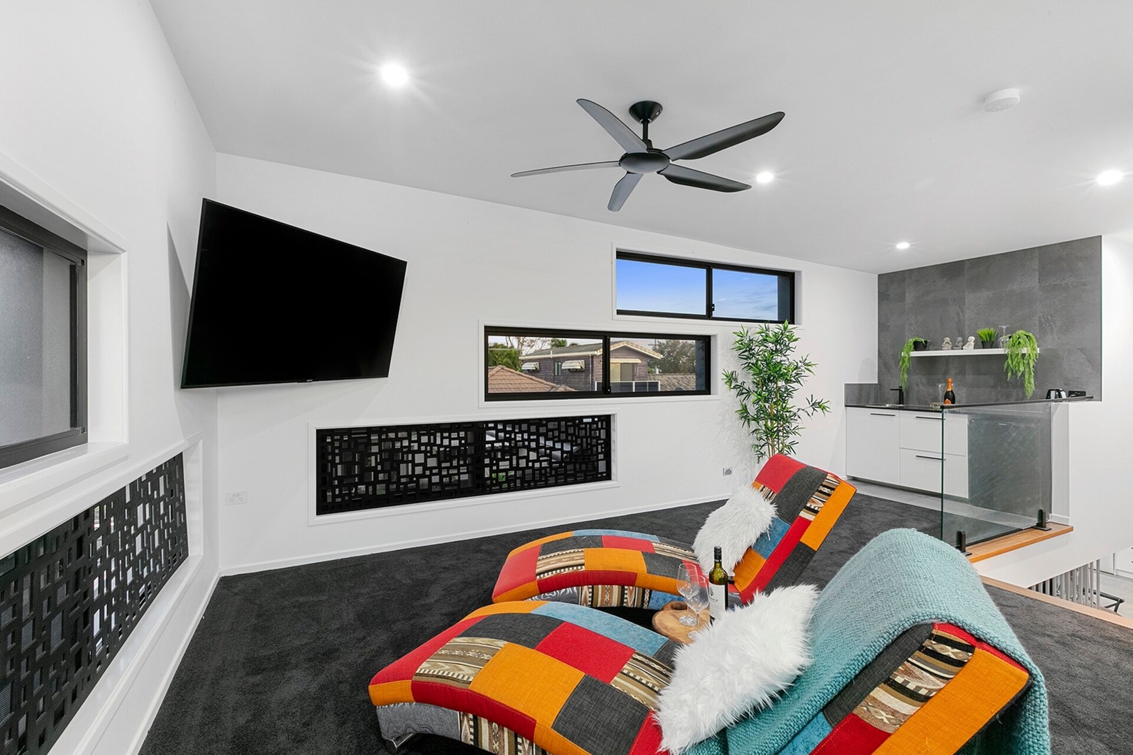 The generously sized master bedroom on the second level landing features a TV lounge and a wet bar as well as split-system heating and cooling, a walk-in robe and ensuite bathroom. Guests can enjoy a relaxing soak in the freestanding bathtub before hopping between the sheets.